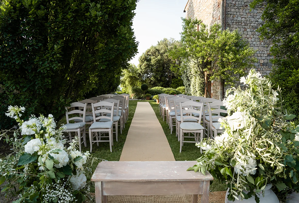 Montecastelli mette a disposizione tanti spazi esterni per diversificare i vari momenti di ogni evento, con un massimo di 48 posti a sedere a tavola nel cortile centrale.
